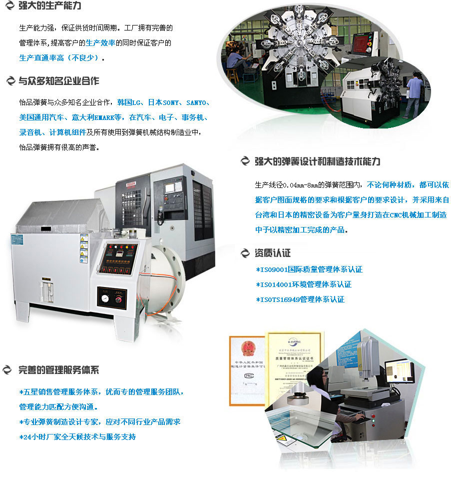 東莞怡品五金制品有限公司秉持著品質,追求完善,為顧客提供高質量的產品和滿意的服務的經營理念企業,公司是一家五金彈簧制品廠家;產品受國內外名廠采用。如:韓國LG、日本SONY、SANYO、美國通用汽車、意大利EMARK等,在汽車、電子、事務機、錄音機、計算機組件及所有使用到彈簧機械結構制造業中,怡品五金制品擁有很高的聲譽... 了解更多